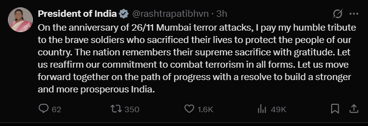 Citizens, including students from various schools and colleges, are participating in pledge-taking ceremonies to reinforce a collective commitment to peace, vigilance, and national security. The heroic efforts of police and security forces are being remembered with profound respect, officers like Assistant Sub-Inspector Tukaram Omble, who sacrificed his life capturing the lone surviving terrorist, and Major Sandeep Unnikrishnan, who led the NSG operation to reclaim the Taj Hotel but was fatally wounded during combat.