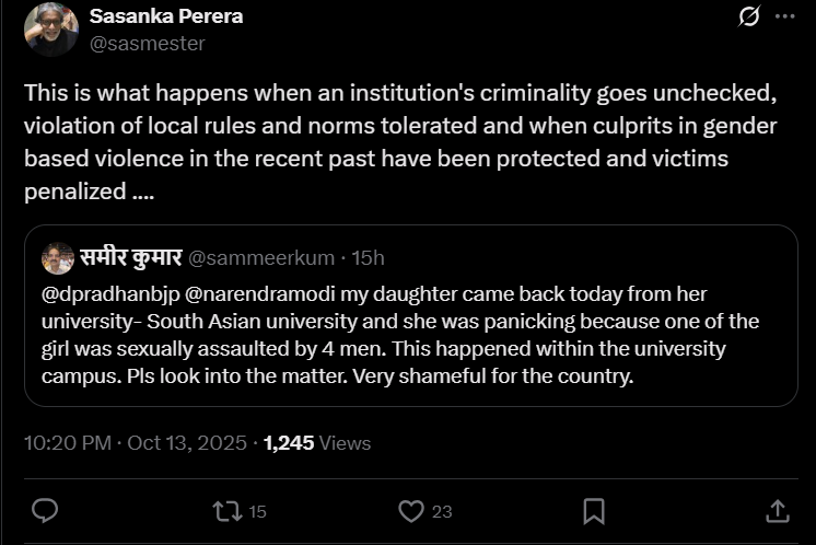 Students are protesting at the campus, the incident has also brought to light glaring lapses in South Asian University’s internal security systems. Students have raised serious concerns about several areas on the SAU campus, especially those under construction, which reportedly lack proper CCTV coverage and adequate lighting
