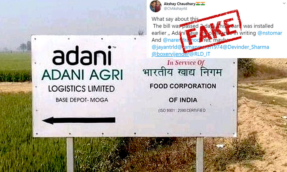 In light of this, a photograph of a billboard in Moga district of Punjab having the Food Corporation of India [FCI] name with Adani Agri Logistics Limited is being circulated on social media. Viral claims suggested that Adani Logistics Limited has set up a food silo right after the three farm and agriculture-related bills were passed in the Parliament.