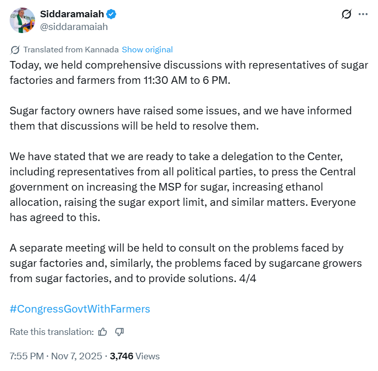 However, farmer leader Chunnappa Pujari expressed caution, noting the farmers’ original demand of Rs 3,500 has not been fully met and called for the sugar minister’s written assurance of the price hike.