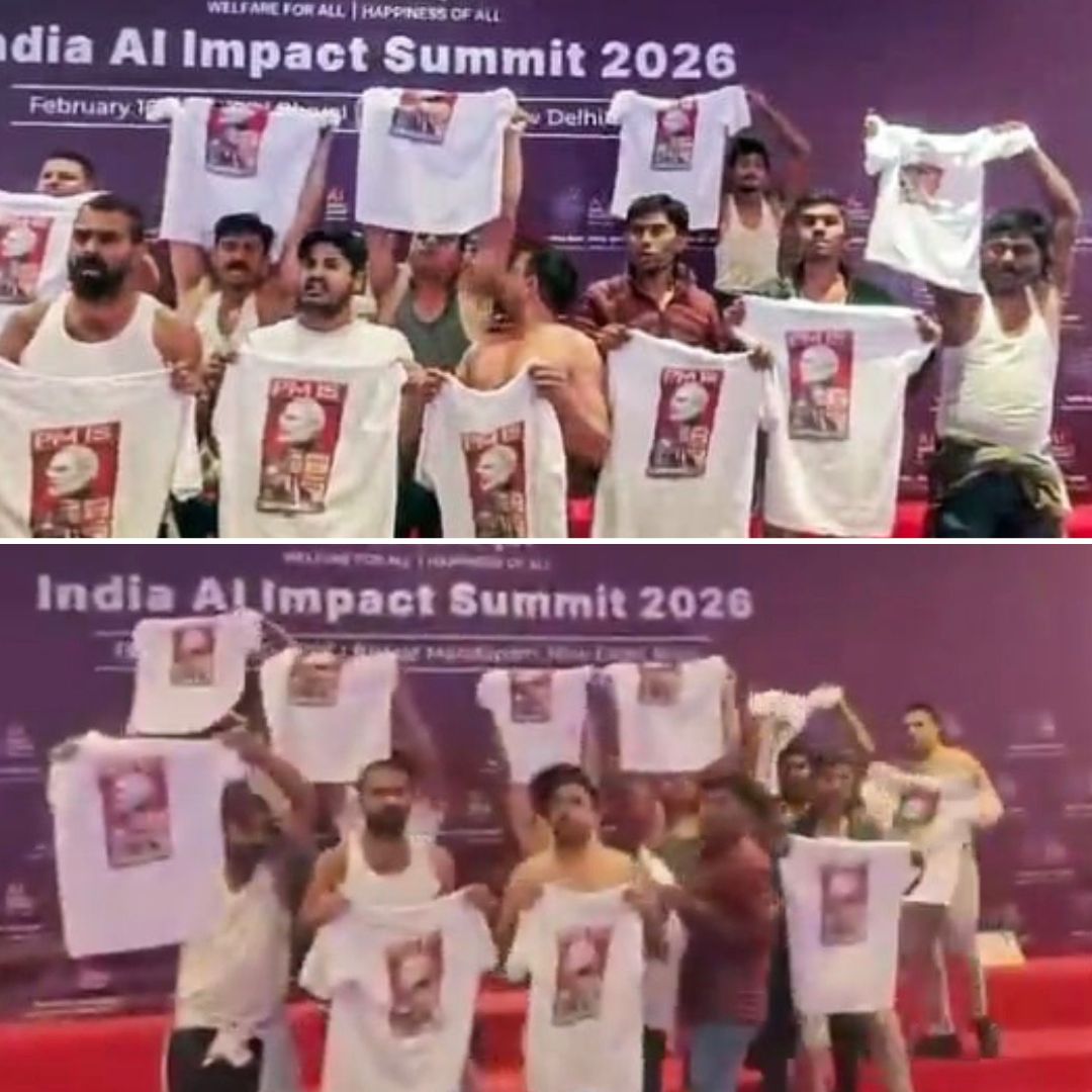 Workers of the Indian Youth Congress (IYC) staged a shirtless protest inside Bharat Mandapam during the India AI Impact Summit 2026 on 20 February in New Delhi, raising slogans against Prime Minister Narendra Modi and the Centre over alleged unemployment, inflation and concerns linked to economic and trade policies.