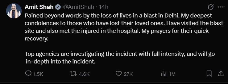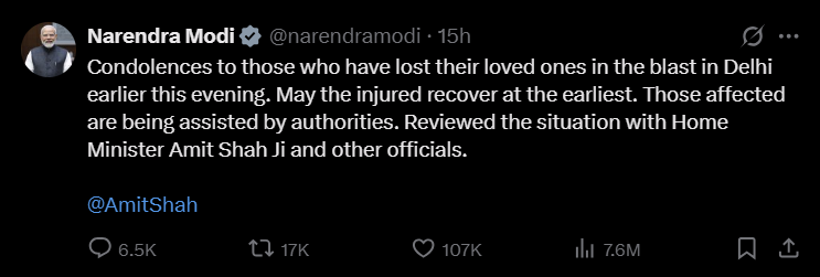 Modi firmly declared that all those responsible for this act of terror, the conspirators behind the blast, will be brought to justice and pledged that they “will not be spared.” He emphasised that investigative agencies had been working overnight to uncover the full truth behind this conspiracy and that the government’s resolve against terrorism remains unyielding.