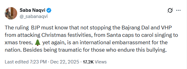On Monday, 22 December 2025, men allegedly linked to Bajrang Dal were seen confronting a group of Christian women and children in the Lajpat Nagar area of New Delhi in a viral video.