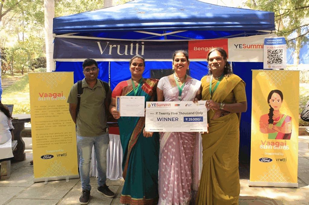 Swetha, a transwoman entrepreneur from Chitra Textiles, made ₹29,800 in sales, earned ₹20,000 profit, and won the business pitch at YESummit 2025.
