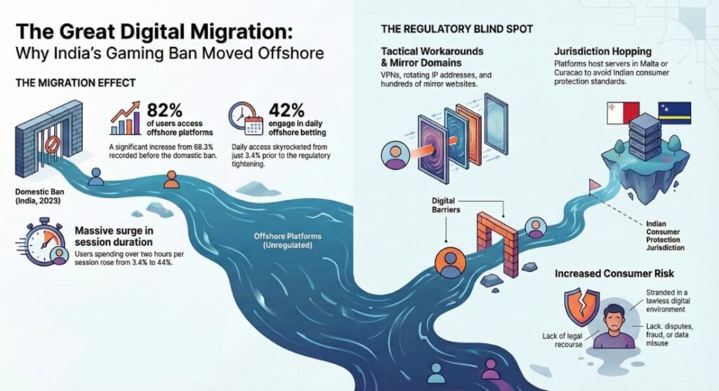 Researchers concluded that many users did not abandon gambling after the ban. Instead they shifted to foreign platforms operating beyond Indian regulatory oversight.