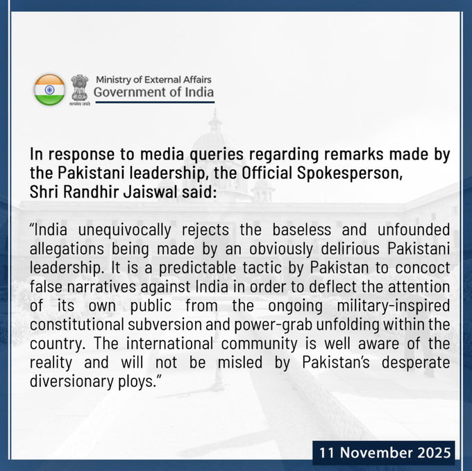 MEA spokesperson Randhir Jaiswal said Pakistan’s narrative was a predictable tactic to “deflect the attention of its own public” from the military-inspired constitutional power grab unfolding in Pakistan. The international community, he added, was aware of the facts and would not be misled by these “desperate diversionary ploys.”