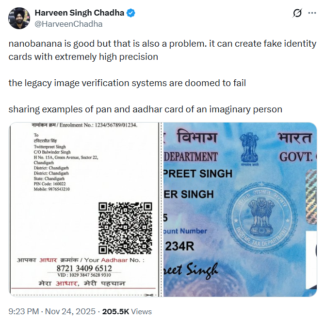 He posted AI-generated images of these cards under the name “Twitterpreet Singh” on social media to highlight the serious security risks posed by such technology. Chadha warned that while Nano Banana is impressive in its precision, it poses a threat to existing image verification systems, which he described as “doomed to fail.”