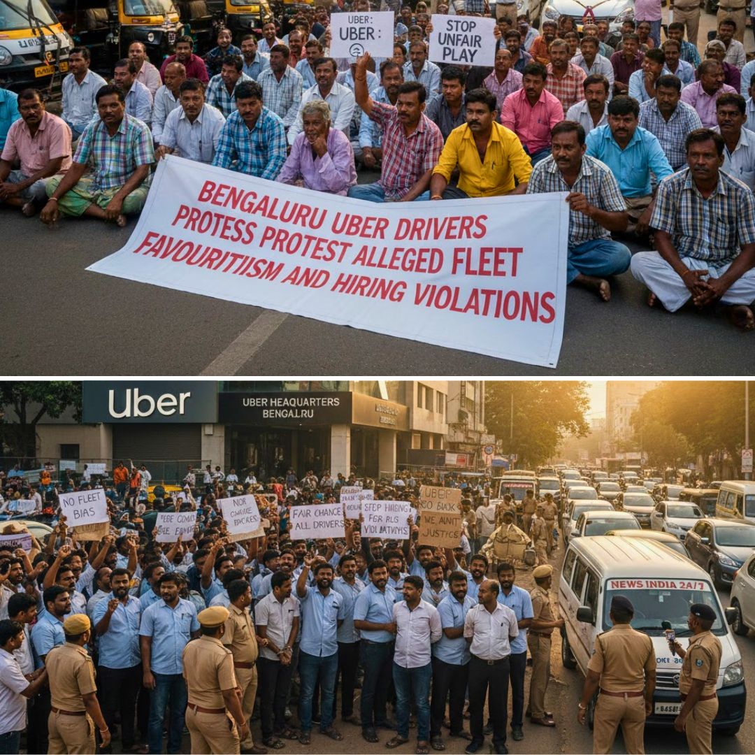 Hundreds of Uber drivers protested outside the company’s driver attachment centre in Bommanahalli, Bengaluru, on Monday, accusing the company of favouring fleet-owned vehicles over independent drivers and hiring drivers from outside Karnataka, including allegedly from Bangladesh.