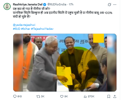 RJD leaders questioned Kumar’s “mental state” and said no woman in Bihar could feel safe if such behaviour was normalised by the highest elected office.