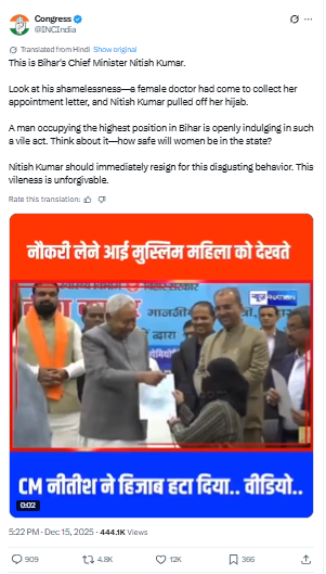 In the widely shared video, Nitish Kumar is seen handing a letter to Dr Nusrat Parveen, questioning her face covering, pointing at her veil and then abruptly pulling down her hijab, exposing her face to the audience before she is hurried off the stage.