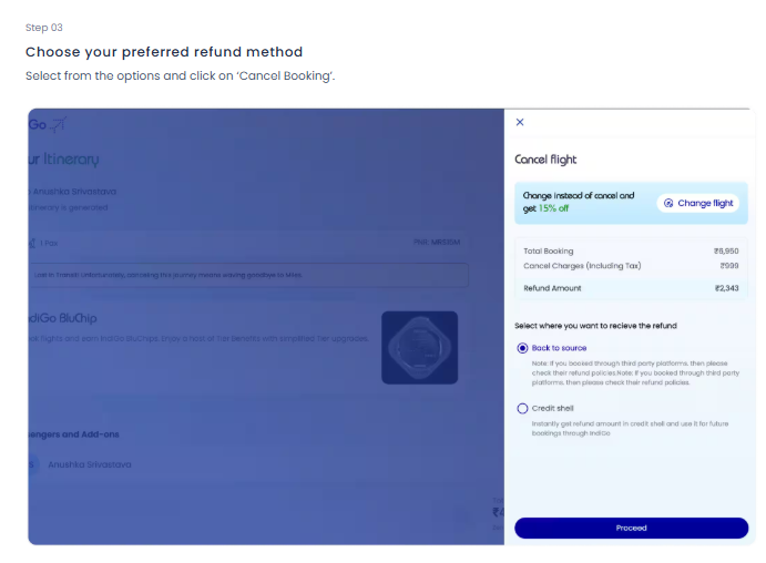 How to use it: log in to your booking on the IndiGo website/app and look for the Plan B banner or the refund/cancellation links. The airline’s refund pages also let you track refund status with your PNR and email/last name. Refunds are usually processed to the original payment method processing can take several working days. (