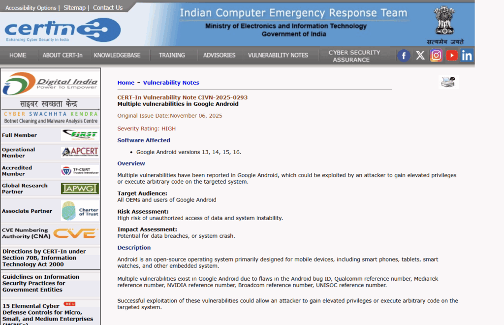 The Indian Computer Emergency Response Team (CERT-In) has issued a high alert urging users to install the November 2025 security update released by Google and device manufacturers immediately. Samsung, Xiaomi, and other brands have also rolled out patches to address this critical threat.