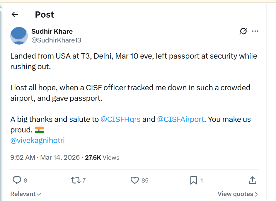 Rather than simply depositing the document at the standard lost-and-found counter and awaiting a claim, the CISF officer chose to actively search through the crowd and reunite the passenger with his document on the spot. Khare took to social media to thank the officer and the post quickly caught wider attention. Agnihotri, the director of The Kashmir Files, reshared it with warm praise for the force. The CISF‘s official account acknowledged the commendation, reinforcing the force’s pride in the officer’s conduct.