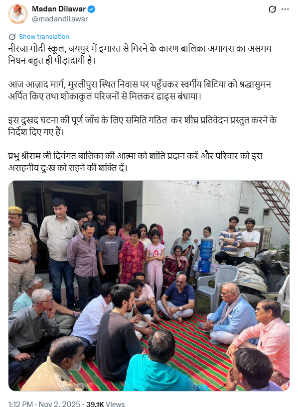 According to official statements, the minor girl, who was her parents’ only child, was rushed to hospital after the fall but was declared dead upon arrival. Mansarovar police station SHO Lakhan Khatana confirmed the ongoing investigation, emphasising that forensic experts had collected samples and that questioning of staff and students was underway.