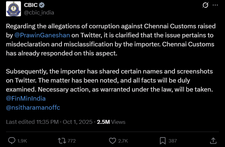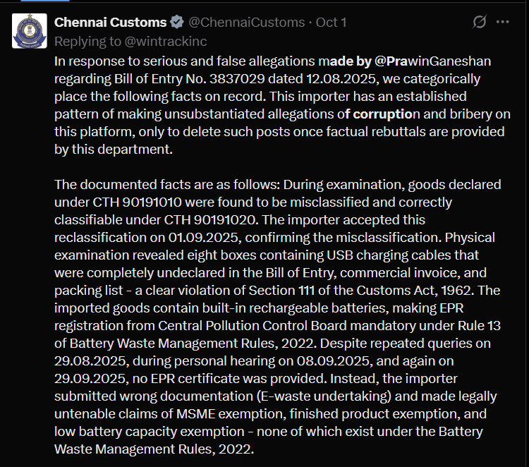 In response, Chennai Customs issued a detailed rebuttal, denying any involvement in corruption or harassment. They attributed the delays and issues to violations such as misclassification of goods and missing environmental compliance certificates.