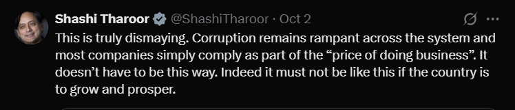Congress MP Shashi Tharoor described the Wintrack-Chennai Customs controversy as “truly dismaying,” stating that corruption remains rampant across the system. He added that most companies comply with such demands as part of the “price of doing business” but emphasised, “It doesn’t have to be this way if the country is to grow and prosper.”