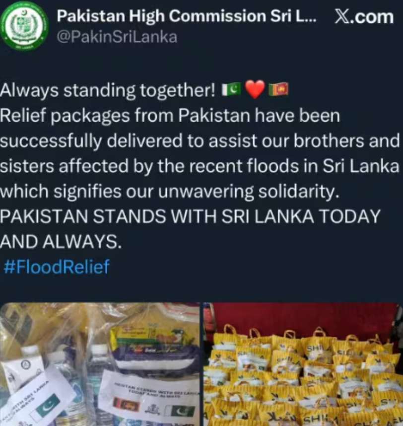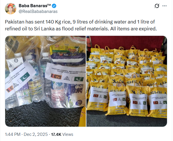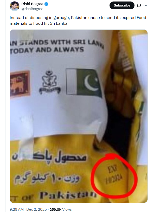 Pakistan High Commission’s X post stated, “Always standing together! Relief packages from Pakistan have been successfully delivered to assist our brothers and sisters affected by the recent floods in Sri Lanka, which signifies our unwavering solidarity,” but close inspection revealed October 2024 expiry dates on visible packets, prompting deletions and viral screenshots.