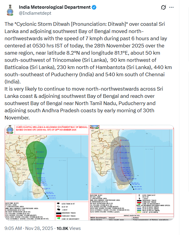 The India Meteorological Department (IMD) has confirmed that Cyclonic Storm Ditwah, currently located about 440 km south-southeast of Puducherry and 540 km south of Chennai, is moving north-northwest towards the coasts of northern Tamil Nadu, Puducherry, and southern Andhra Pradesh.