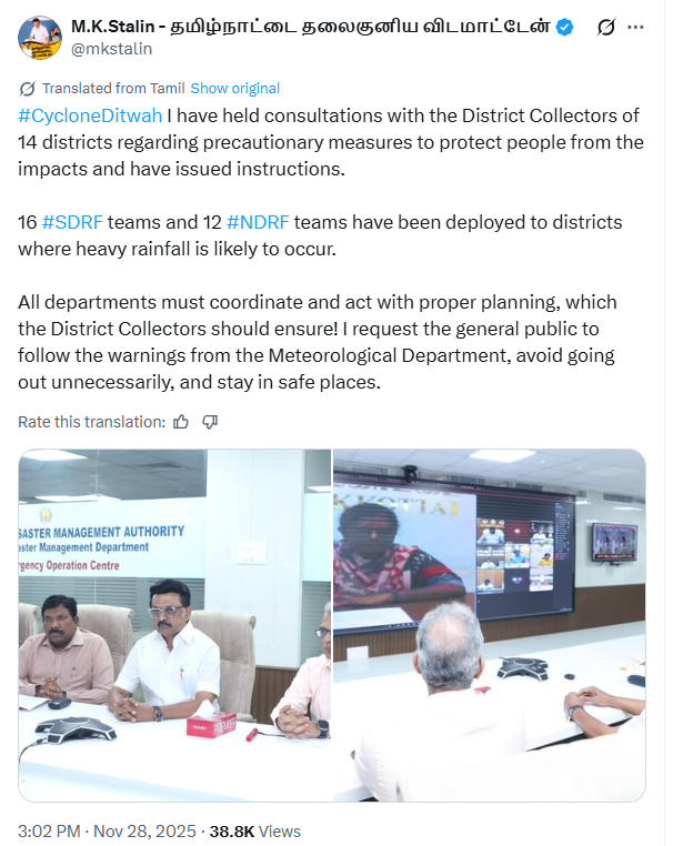 Tamil Nadu Chief Minister M.K. Stalin convened a special meeting with district collectors and top officials to strengthen preparedness ahead of Cyclone Ditwah’s expected landfall.