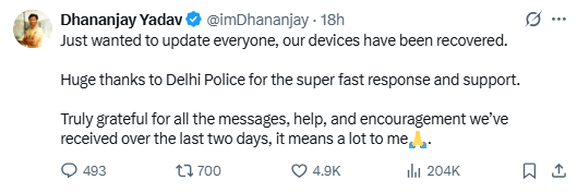 Delhi Police have since recovered the devices, prompting praise from Yadav. In a post on X, he said: “Just wanted to update everyone, our devices have been recovered. Huge thanks to Delhi Police for the super fast response and support. Truly grateful…”