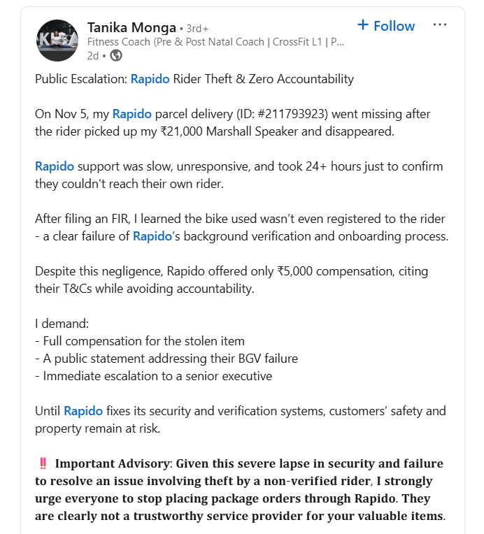 On November 5, Monga booked Rapido’s parcel service to send a prized Marshall speaker worth ₹21,000. The rider picked it up but never delivered it, she alleges. Her public LinkedIn post detailing the ordeal went viral, calling out Rapido under the headline “Public Escalation: Rapido Rider Theft & Zero Accountability.”