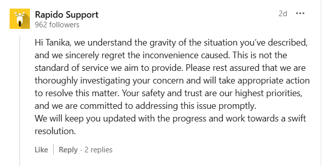 In the comments, Rapido left a note saying, “Hi Tanika, we understand the gravity of the situation you’ve described, and we sincerely regret the inconvenience caused. This is not the standard of service we aim to provide.”