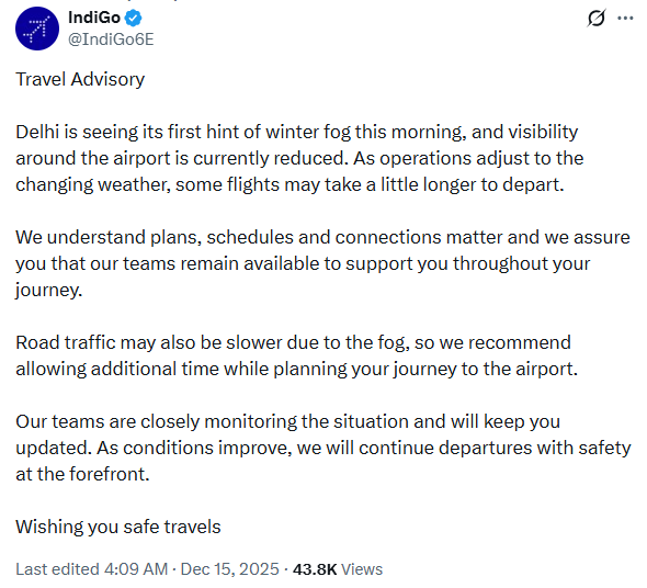 — Delhi Airport (@DelhiAirport) December 15, 2025