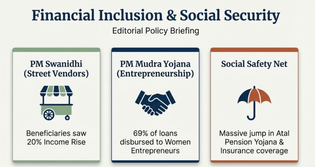 The survey highlights the success of targeted financial schemes like PM Mudra and PM SVANidhi.