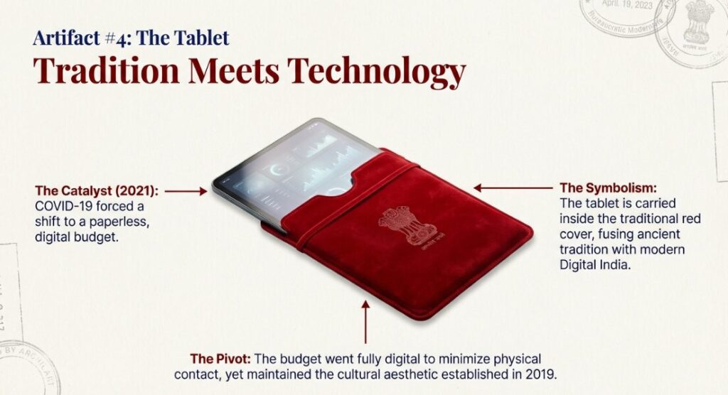 By 2021, the tradition evolved again due to the pandemic. The budget became fully digital. To maintain the cultural connection, the tablet used for the speech was still housed in a red Bahi-Khata-style cover, blending modern technology with ancient heritage.