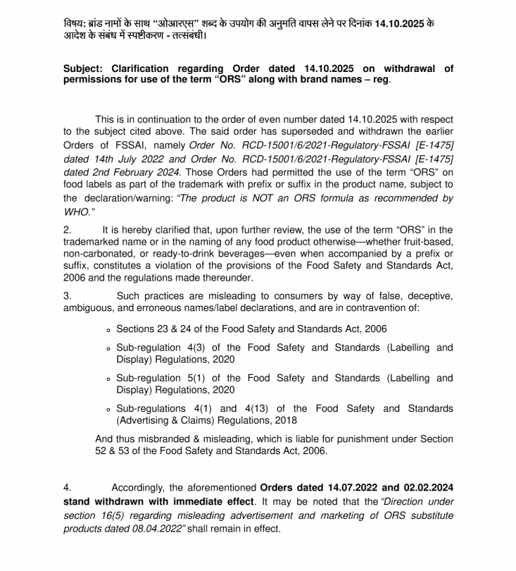 In a surprising regulatory pivot, the Food Safety and Standards Authority of India (FSSAI) withdrew all prior restrictions on the usage of the term “ORS” (Oral Rehydration Salts) in food and beverage product names on October 14, 2025.