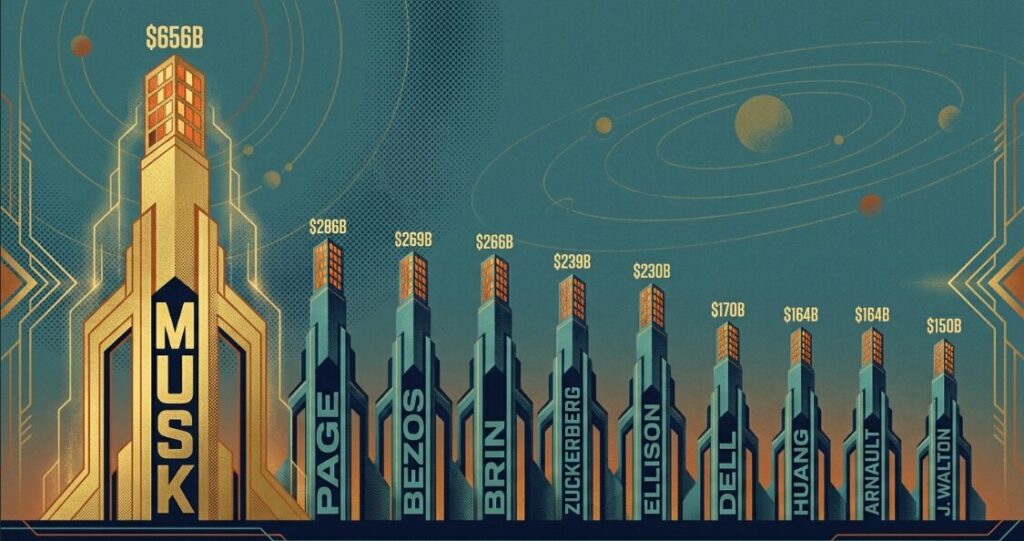 The top 10 list remains dominated by U.S.-based tech billionaires including Larry Page, Jeff Bezos, Sergey Brin, Mark Zuckerberg, and Larry Ellison, alongside investor Warren Buffett and luxury sector leader Bernard Arnault.