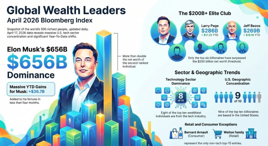 A defining feature of the Bloomberg Billionaires Index remains the dominance of technology-linked wealth in the top global positions.