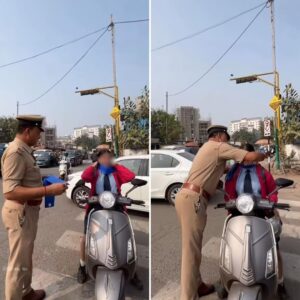Surat police distribute neck collars and safety arches to bikers to prevent fatal injuries from kite manjha.