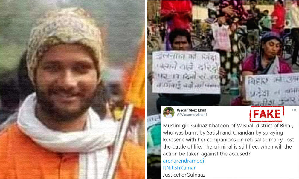 They are sharing the image of the boy with the caption, ‘बिहार के वैशाली जिले की गुलनाज़ जिसे सतीश_कुमार और चंदन_कुमार ने शादी से इंकार करने पर अपने साथियों के साथ मिलकर मिट्टी का तेल छिड़क कर जला डाला था वह ज़िन्दगी की जंग हार गई और उनका निधन हो गया ,अपराधी अभी भी आज़ाद है बलात्कारी की पहचान आप कपडे से कर सकते है। #JusticeForGulnaz’ (Which translates in English as, ‘Gulnaaz of Vaishali district of Bihar who was set ablaze by Satish Kumar and Chandan Kumar with support of their friends by sprinkling kerosene because she refused the marriage proposal , has lost the battle of life and died, the culprit is still free. You can identify the rapist with his clothes. #JusticeForGulnaz.’)