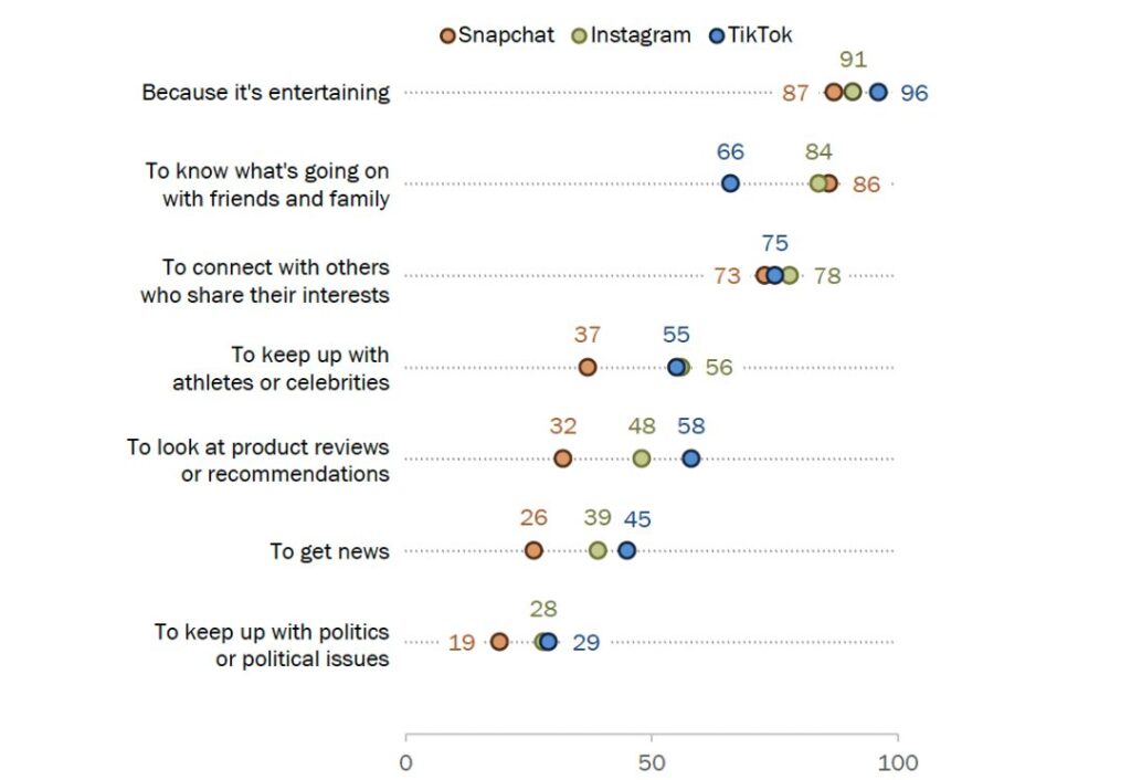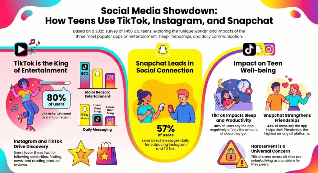 While roughly nine-in-ten teens use TikTok, Instagram, or Snapchat for entertainment, TikTok stands alone as the undisputed heavyweight of the attention economy. An incredible 80% of its teen users cite entertainment as a “major reason” for their presence on the app.
