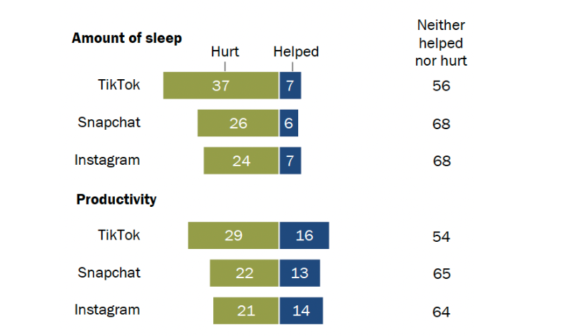 This is significantly higher than the quarter of users on Snapchat or Instagram who report the same. When we look at productivity, the ability to get things done, TikTok users are again the most likely to say the app has a negative impact on their daily output.