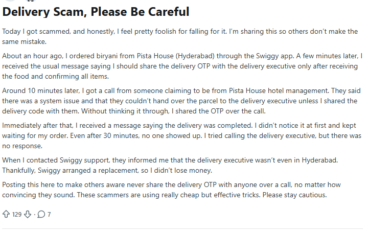 “I got scammed, and honestly, I feel pretty foolish,” he posted on social media, where the thread exploded with over 5,000 views in hours. Contacting Swiggy support revealed the twist: the assigned executive was in Vijayawada, 270 km away. Scammers had intercepted the OTP remotely, faking completion via the app.
