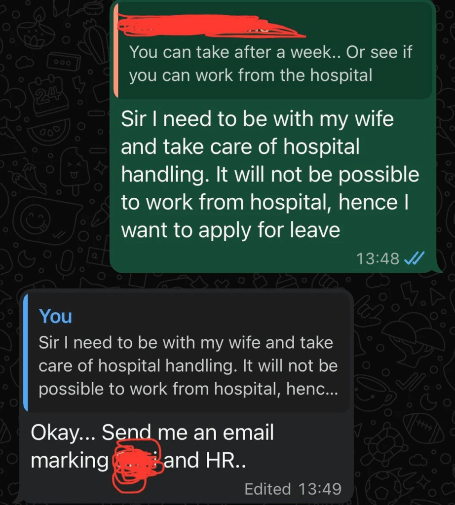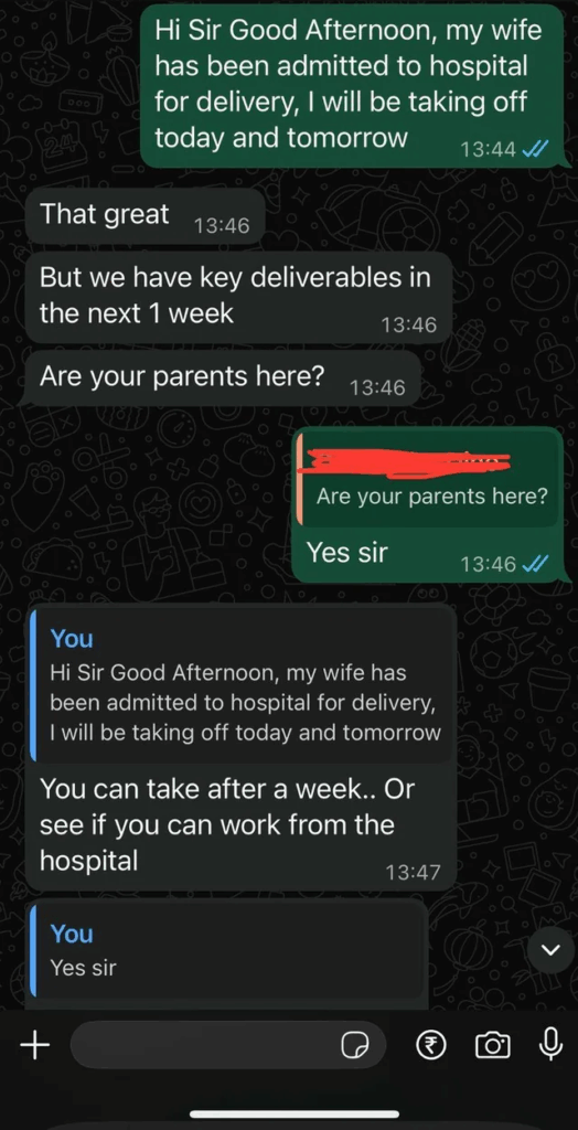 The man had requested two days of leave to be with his wife during childbirth, but his manager asked him either to delay the leave or continue working from the hospital. This incident triggered widespread outrage on social media and drew attention to the challenges employees face when balancing urgent family obligations with workplace demands.