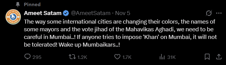 His remark “If someone tries to impose a ‘Khan’ on Mumbai, it will not be tolerated!” was perceived widely as a communal appeal ahead of Mumbai’s local elections. Satam claimed that political opponents are engaging in “vote jihad” to secure power through religious polarization.