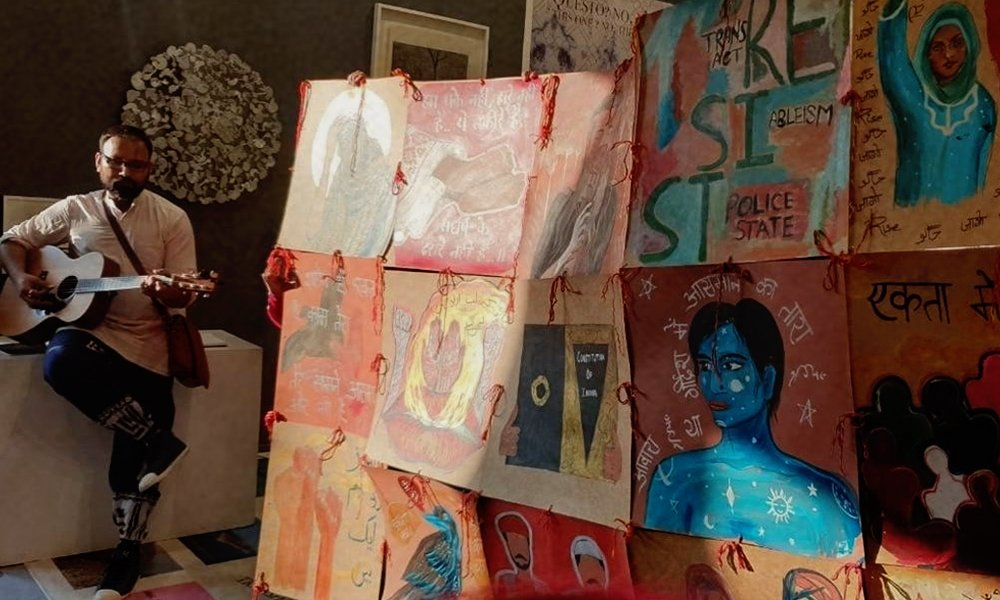 ‘Our booth was a 4-day-long event and we unveiled ‘The Wall’ on the last day. It was a live mural-painting exercise, in concurrence with the resurgence of popular culture that the nation-wide protests had sparked. Artists were called in batches of three to paint it live, and by 5:30 pm on February 2, the artwork was completed. We then began to engage the audience with live music, spoken word poetry, and the tying of sacred threads.’