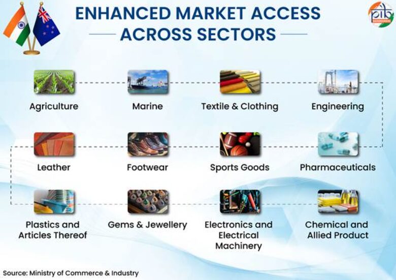 The most immediate and quantifiable outcome is tariff elimination. India will receive 100% duty-free market access for its exports to New Zealand, covering 8,284 tariff lines. This effectively removes a major cost barrier for Indian exporters in sectors such as textiles, pharmaceuticals, engineering goods, and chemicals.