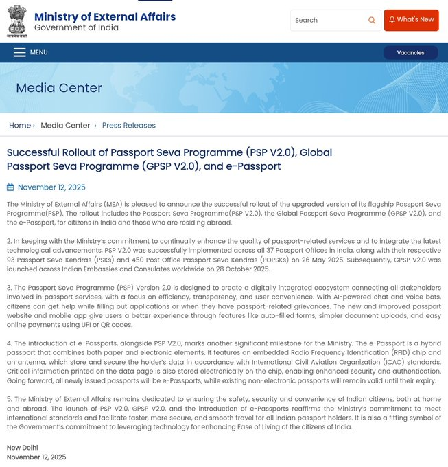 The rollout of these biometric e-passports is part of the upgraded Passport Seva Programme 2.0, launched nationwide by May 2025 across 37 Regional Passport Offices and 544 Passport Seva Kendras.