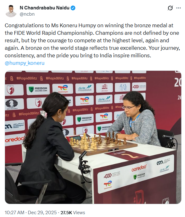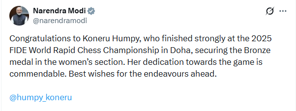 In a post on X, he wrote, “Congratulations to Koneru Humpy, who finished strongly at the 2025 FIDE World Rapid Chess Championship in Doha, securing the Bronze medal. Her dedication towards the game is commendable.”