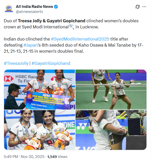 Indian badminton duo Treesa Jolly and Gayatri Gopichand successfully defended their women’s doubles title at the Syed Modi International 2025 in Lucknow, defeating Japan’s 8th-seeded pair Kaho Osawa and Mai Tanabe 17-21, 21-13, 21-15 in a thrilling 74-minute final.