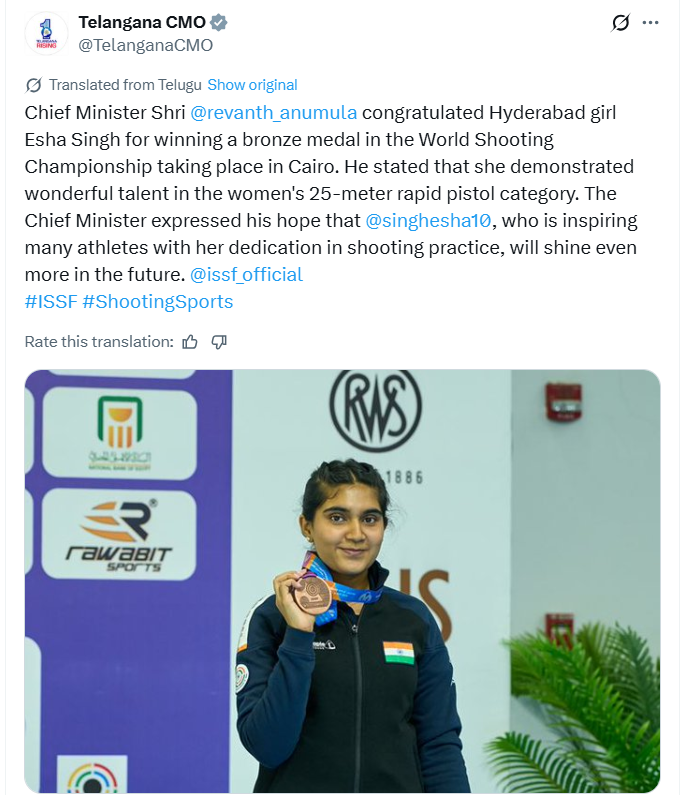 Esha secured bronze after a three-way shoot-off, scoring 30 out of 50 in the final. Fellow Indian shooter and double Olympic medallist Manu Bhaker finished fifth after a shoot-off. India finished third overall with three golds, five silvers, and four bronze medals.