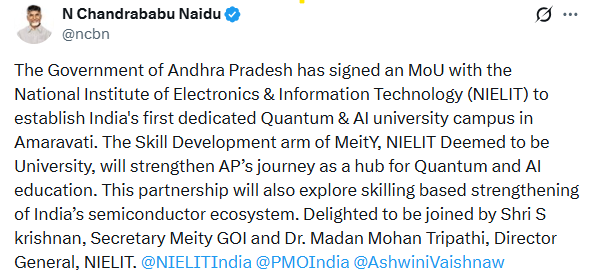 Speaking on the partnership, Dr. M. M. Tripathi, Director General of NIELIT, said the Amaravati campus will become a national center of excellence for both research and education in quantum technologies and AI. This reflects NIELIT’s mission to advance skilling, research, and capacity building across frontier technologies in India.