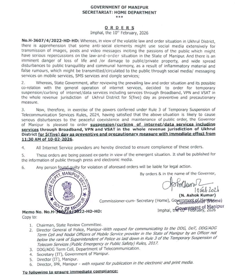The Manipur government on 10 February 2026 announced a temporary five-day suspension of internet and data services – including mobile internet, broadband, VPN and VSAT – across the entire revenue district of Ukhrul in response to a recent outbreak of violence.