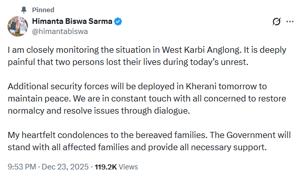 Two Killed, Several Injured, Internet Suspended in Assam’s Karbi Anglong Amid Violent Unrest; CM Sarma Mourns
