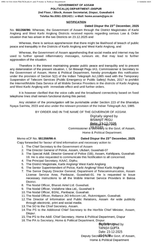 To curb the rapid spread of lethal misinformation and inflammatory content on social media, the Assam government has suspended mobile internet and data services across the Karbi Anglong and West Karbi Anglong districts.