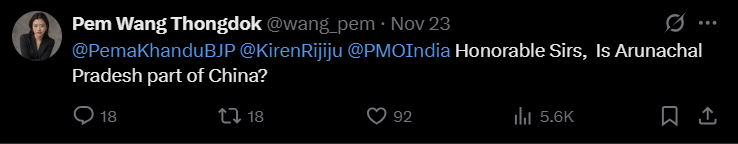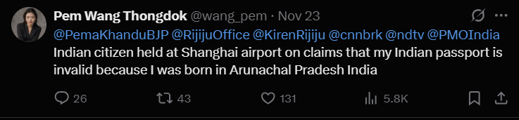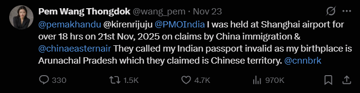 Pem Wangjom Thongdok, an Indian woman born in Arunachal Pradesh and, was detained for over 18 hours at Shanghai Pudong International Airport on November 21, 2025. Chinese immigration officials allegedly refused to acknowledge her Indian passport, claiming it was invalid because her place of birth, Arunachal Pradesh, is a territory claimed by China.